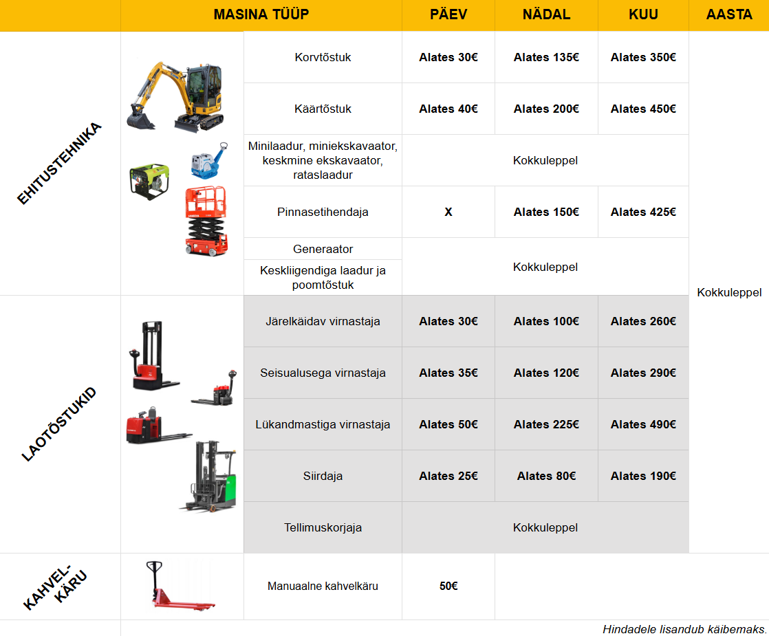 Rendi hinnad kehtivad standardvarustuses masinatele, mille töökoormus on maksimaalselt kuni 2 tundi päevas.
