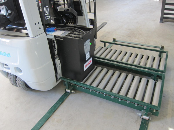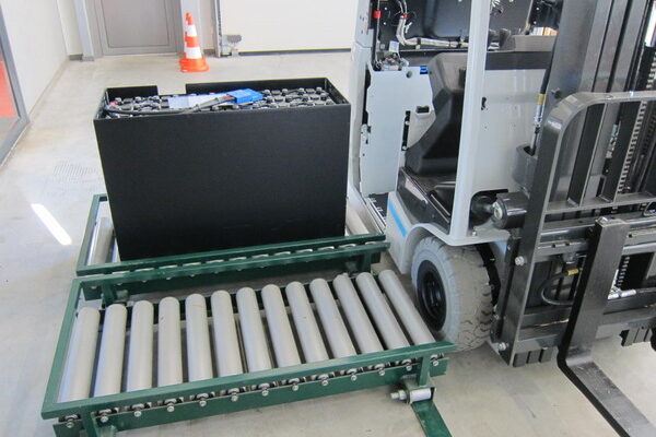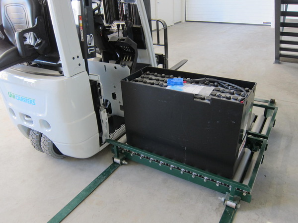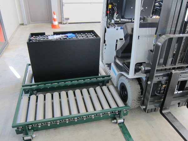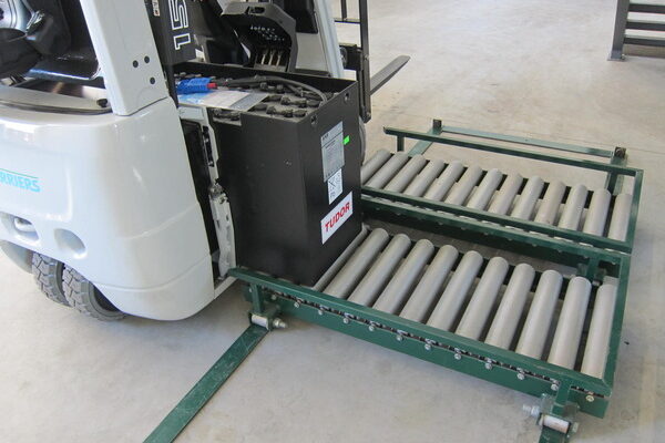 Akude laadimislaud tõstukile, millel sisseehitatud akude vahetussüsteem ja kus kasutatakse kahte akut.