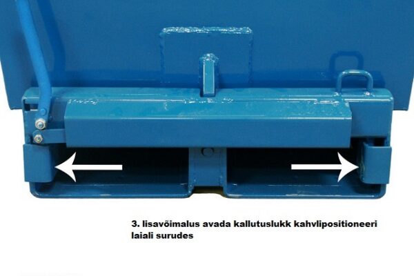 Tugevalt ja lollikindlat ühendatud ilma jäiga liigendita ja vajadusel võimalik väga lihtsalt eraldada. Kallutuslukk avaneb konteineri kallutamiseks nii külje kangist kui ka alaosa esiküljel olevast otsa plaadist st. kui tõstukiga lükata konteineri alaosa esikülg millegi vastu, saab tühjaks kallutada ilma et juht peaks tõstukilt maha tulema.