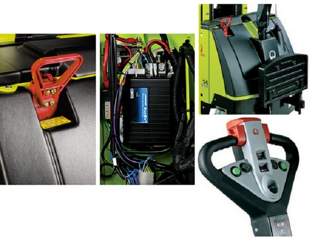 Ergonoomiline käepide kõigi juhtimis funktsioonidega, libliklüliti veojõu juhtimiseks, ohutuslüliti ja signaal, akuindikaator, töötunnikugeja